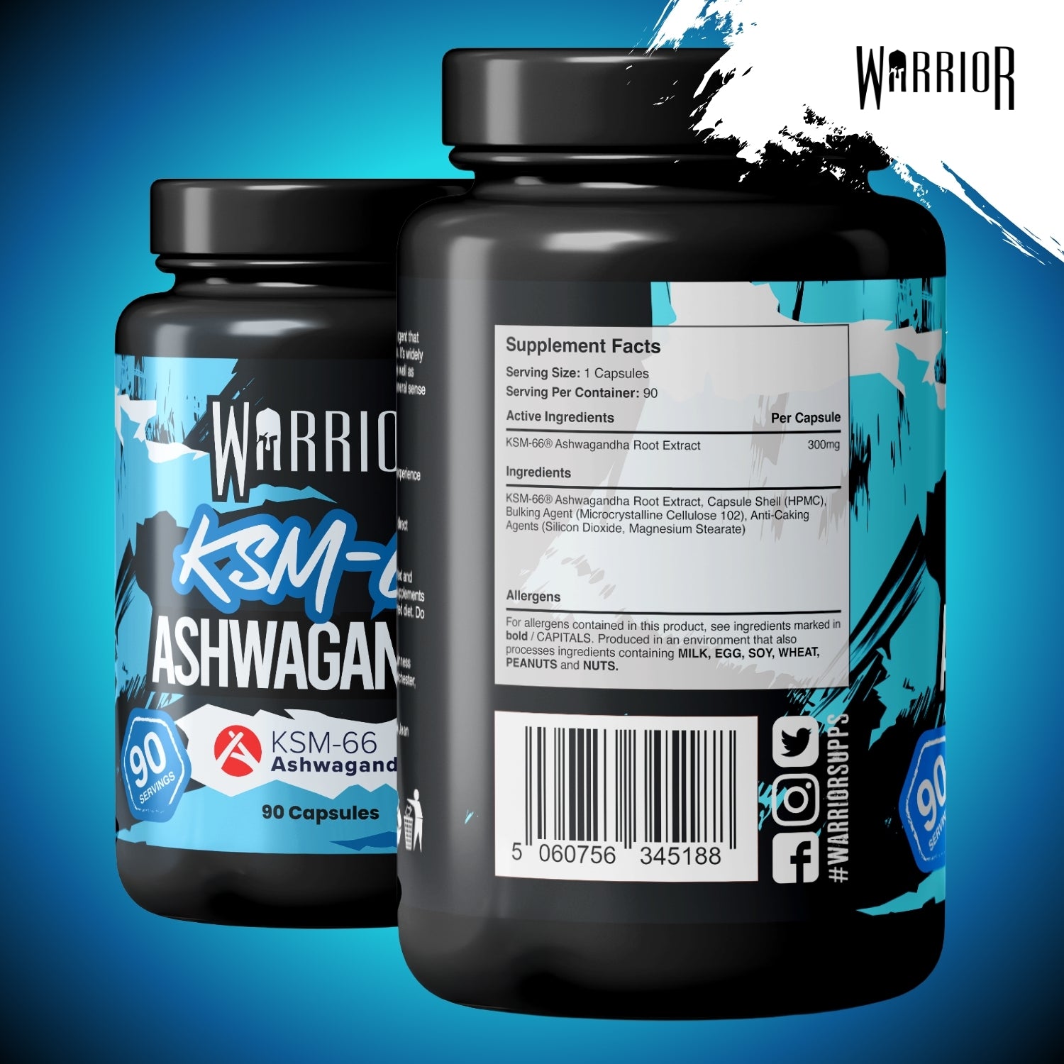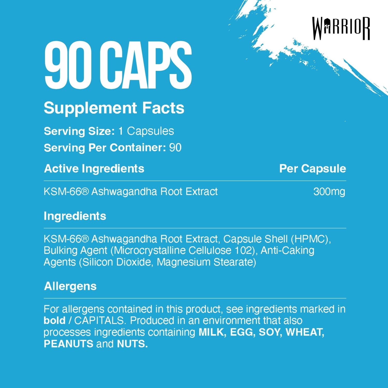 Supplement Facts Ingredients per Capsule Ashwagandha Root Extract - 300mg Other Ingredients KSM-66® Ashwaganhda Root Extract, Capsule Shell (HPMC), Bulking Agent (Microcrystalline Cellulose 102), Anti-Caking Agents (Silicon Dioxide, Magnesium Stearate) For allergens see ingredients in BOLD, produced in an environment containing Egg, Wheat, Soya, Wheat, Peanuts and Nuts |