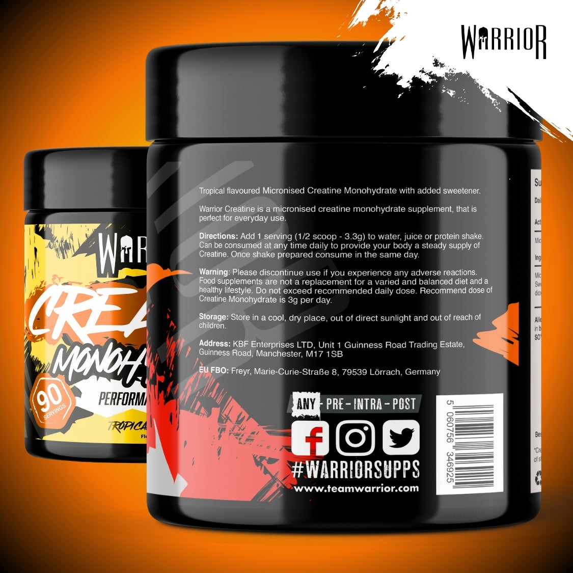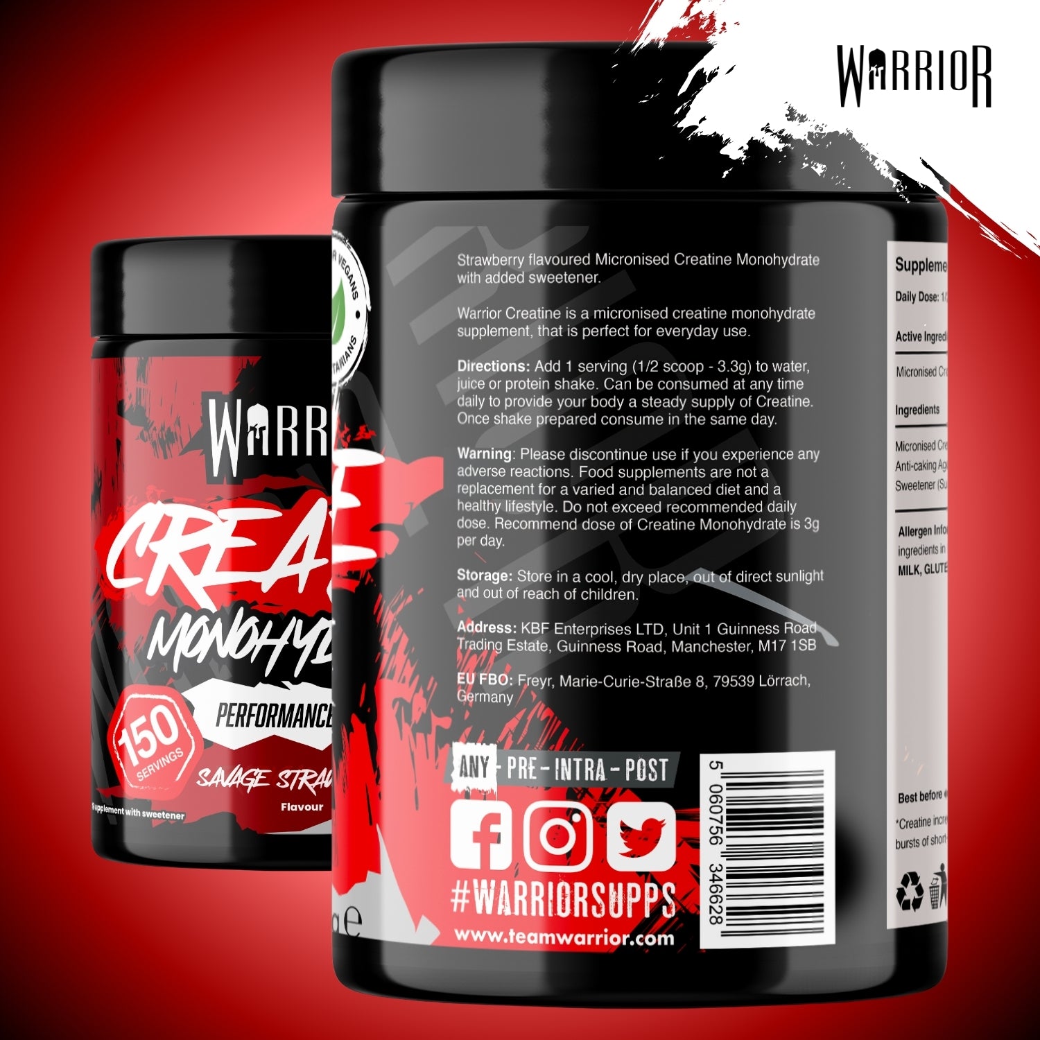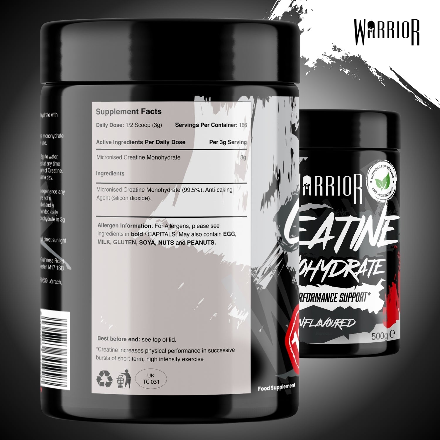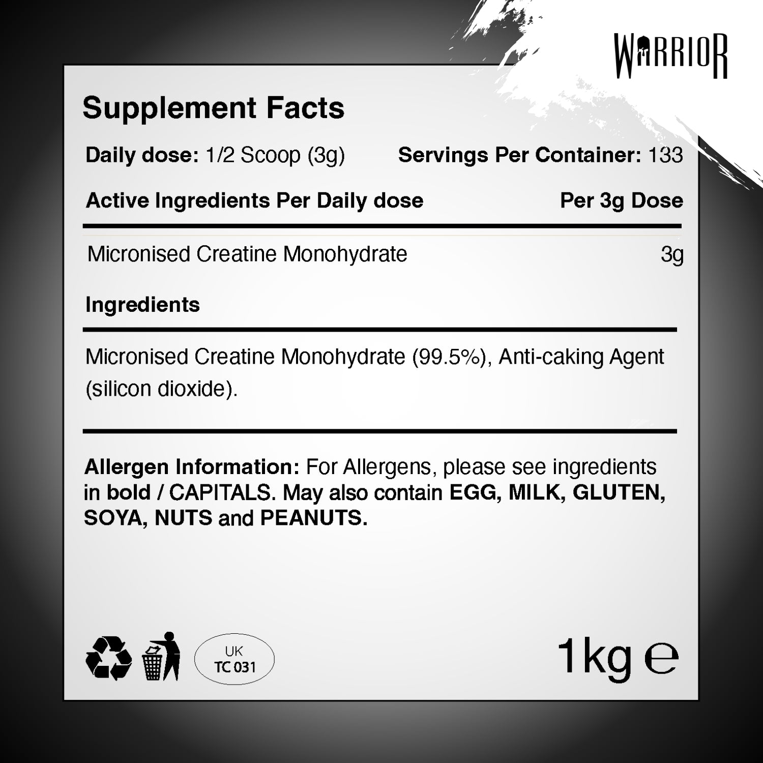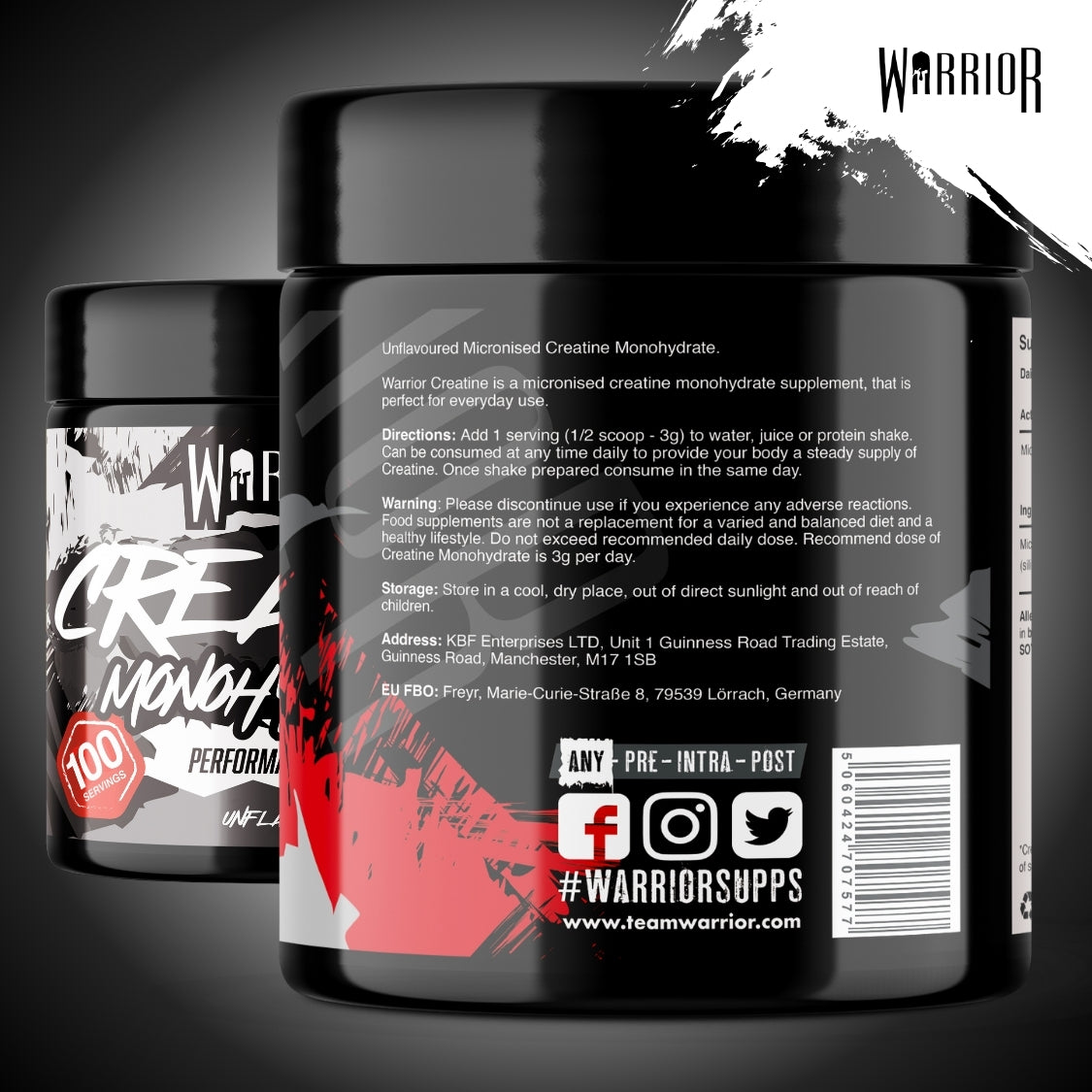 Warrior Creatine is a food supplement, and should be used as part of a balanced and varied diet. Do not exceed recommended dose. Store out of the reach of children. Please consult your Doctor prior to use if you have a medical condition. Not recommended for pregnant or lactating women.