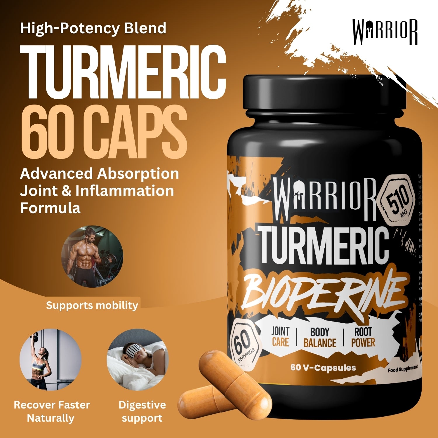 Warrior Turmeric provides you with 500mg Organic Turmeric with an additional 10mg Bioperine included in every capsule. A highly popular supplement, taken to help in the nutritional management of joint health and inflammatory reactions. The supplementation of Turmeric can help to manage blood sugar balance, oxidative stress and inflammation throughout the body.